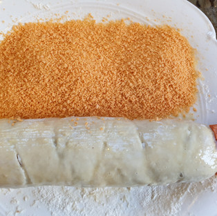 מצפים את הרול בקמח, מושחים בביצה הטרופה ומצפים בפרורי לחם